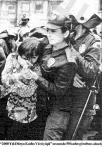 2000 | Yoksulluğa, savaşa, ırkçılığa, şiddete, tacize ve tecavüze karşı 2000 Yılı Dünya Kadın Yürüyüşü’ne destek için Sirkeci Postanesi önünde toplanıp basın açıklamasıyla Birleşmiş Milletler’e kart ve imza göndermek isteyen kadınlardan 50’si dövülerek gözaltına alındı.![]() |