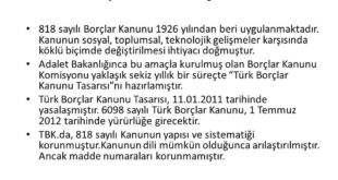 Türk Borçlar Kanunu 6098 kanun numarası ile 11 Ocak 2011’de TBMM’de kabul edilmiştir. Türk Borçlar Kanunu, borçlar hukuku alanındaki kuralları içeren başlıca kanundur. 818 sayılı Borçlar Kanunu 1926 yılından beri uygulanmaktadır. Kanunun sosyal, toplumsal, teknolojik gelişmeler karşısında köklü biçimde değiştirilmesi ihtiyacı doğmuştur. Adalet Bakanlığınca bu amaçla kurulmuş olan Borçlar Kanunu Komisyonu yaklaşık sekiz yıllık bir süreçte Türk Borçlar Kanunu Tasarısını hazırlamıştır. Yeni Türk Borçlar Kanunu 1 Temmuz 2012 tarihinde yürürlüğe girmiştir. TBK’da, 818 sayılı Kanunun yapısı ve sistematiği korunmuştur. Kanunun dili mümkün olduğunca arılaştırılmıştır. Ancak madde numaraları korunmamıştır.